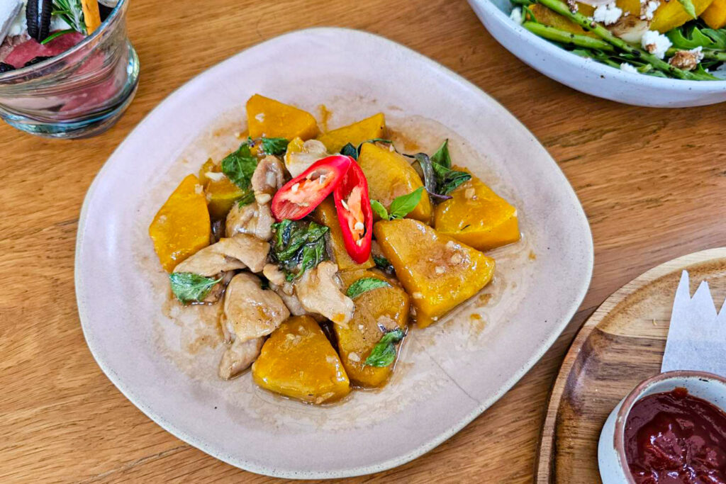 สำหรับเมนูหลัก เชฟแนะนำผัดฟักทองสไตล์ไทยกับหมูสับรสเข้มข้น หอมกลิ่นสมุนไพร ราคา 220 บาท++