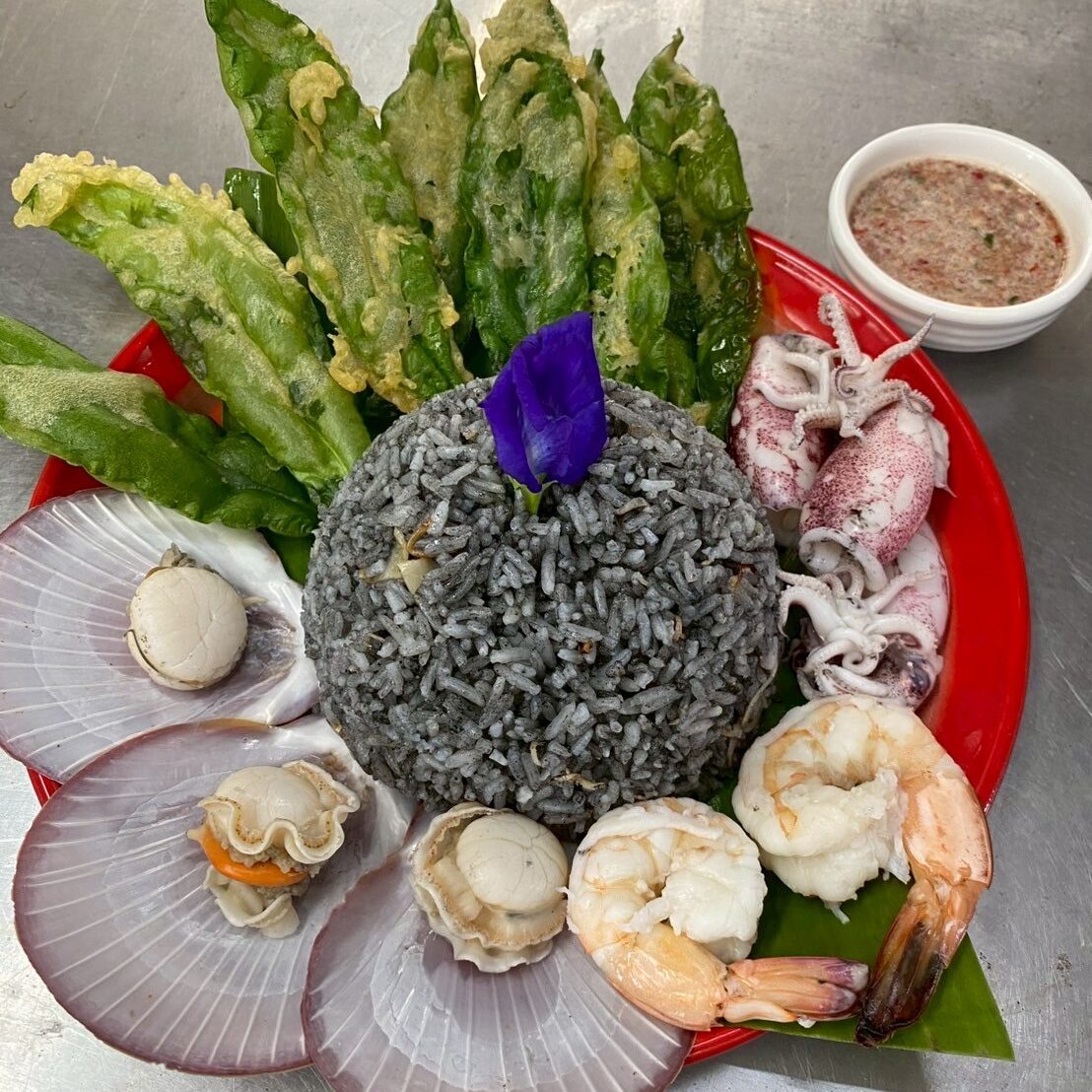 ข้าวมันหอมกรุ่นเคลือบด้วยซอสทะเลสีดำ เสิร์ฟคู่ซีฟู้ดสดใหม่จากอ่าวไทย ราวกับพาคนกินดำดิ่งลงไปในห้วงทะเลคอน