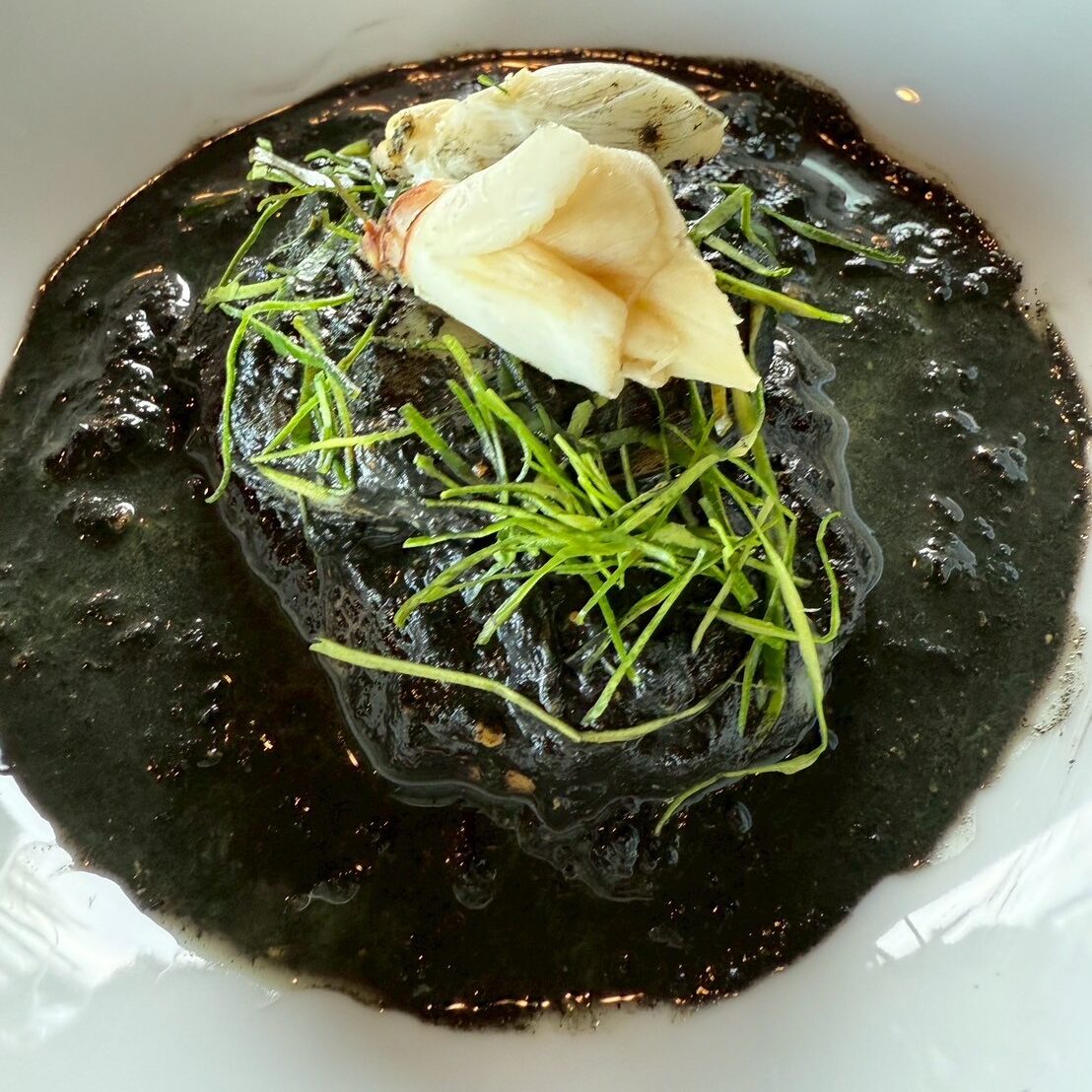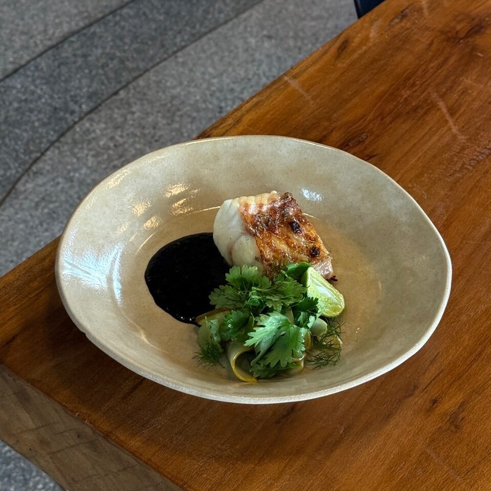 ปลาทะเลสดย่างบนเตาถ่านจนหอมกรุ่น เสิร์ฟคู่ซอสโคลนสีดำที่ทั้งลึกลับและเข้ากันอย่างน่าประหลาดใจ