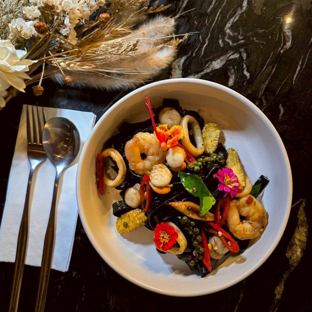 เส้นพาสต้าสีดำปรุงแบบไทยสไตล์ขี้เมา เติมวัตถุดิบทะเลใต้ กลายเป็นฟิวชันอิตาเลียน-ใต้ที่ลงตัว