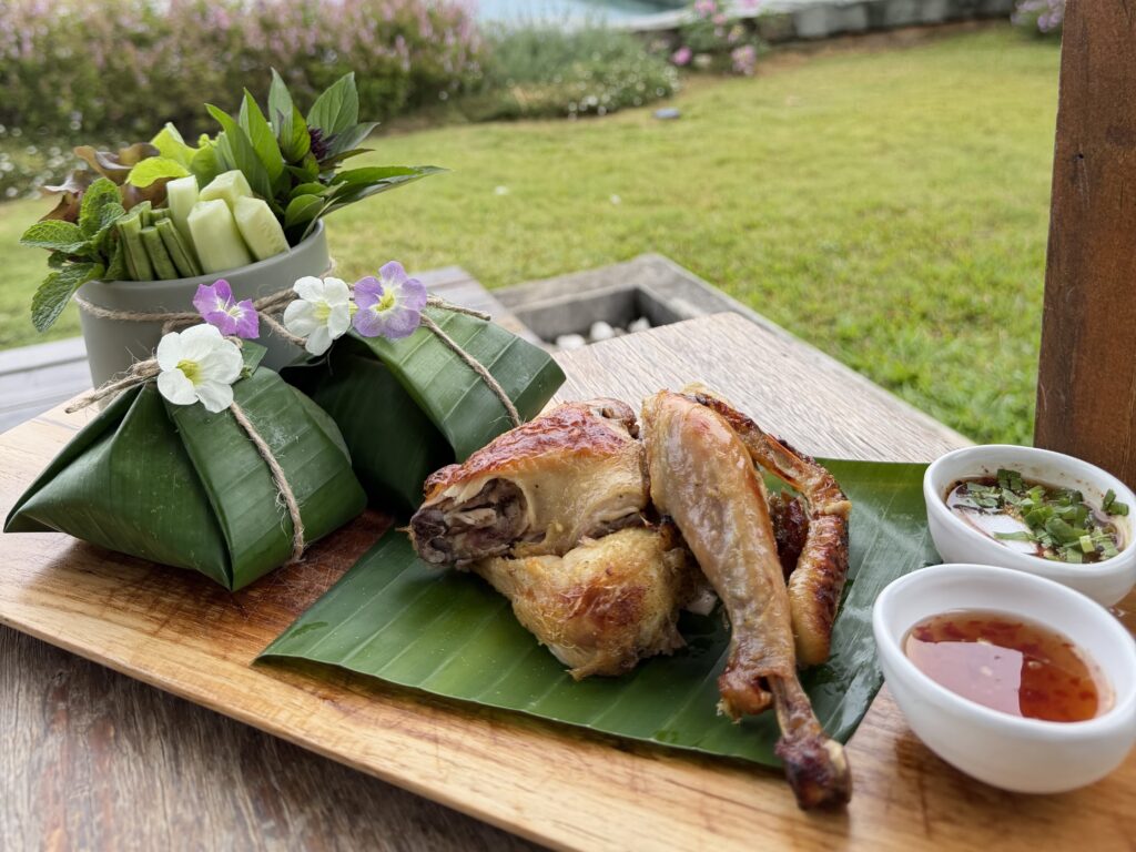 - Herbal Grilled Free-Range Chicken – infused with aromatic Thai herbs, charcoal-grilled to smoky perfection