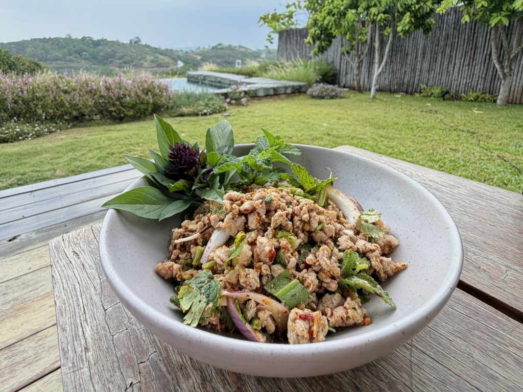 Served with Kheio Ngu sticky rice and organic vegetables from Roukh Kiri’s own garden, each dish brings farm-to-table freshness to the forest setting.