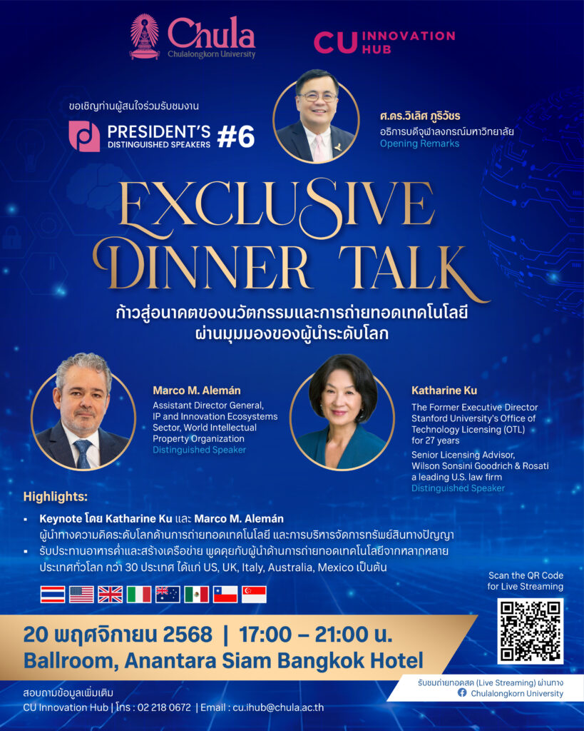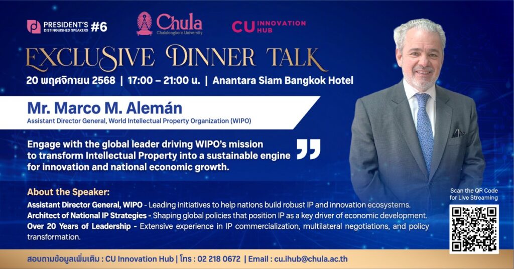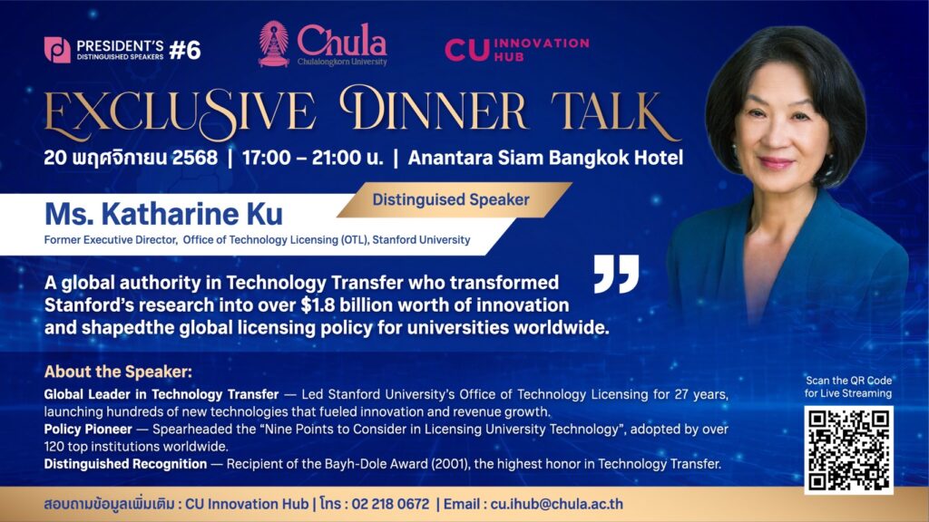 Chulalongkorn University by CU Innovation Hub cordially invites the general public, innovation enthusiasts, and professionals in the innovation business ecosystem to join the live streaming of the “President’s Distinguished Speaker #6” event. The session aims to open new perspectives and share visionary ideas from two world-renowned leaders in innovation and intellectual property, who will discuss their experiences in developing international innovation ecosystems and managing intellectual property on a global scale.