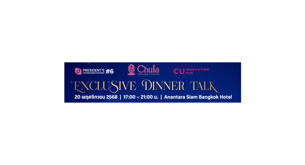 The “President’s Distinguished Speaker #6” will take place on Thursday, November 20, 2025, from 5:00 – 9:00 p.m., at the Anantara Siam Bangkok Hotel. The session will also be available via live streaming on the Facebook Page: Chulalongkorn University.