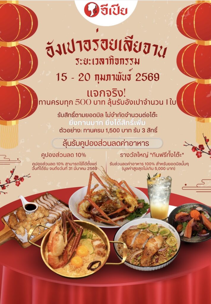 เพื่อฉลองเดือนแห่งความรักและเทศกาลตรุษจีน Epia จัดโปรโมชั่น “อั่งเปาอร่อยเลียจาน” ระหว่างวันที่ 15–20 กุมภาพันธ์ 2569 เมื่อทานครบทุก 500 บาทจะได้รับอั่งเปา 1 ใบ ไม่จำกัดจำนวนต่อโต๊ะ พร้อมสิทธิ์ลุ้นคูปองส่วนลด 10% และรางวัลใหญ่กินฟรีทั้งโต๊ะสูงสุด 5,000 บาท ใช้ได้ถึง 31 มีนาคม 2569