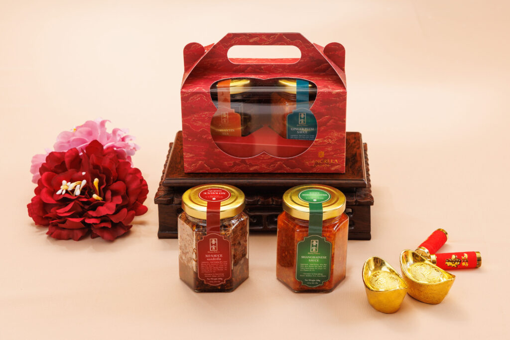 กระเช้าของขวัญต้อนรับตรุษจีน ราคา 6,888 บาท ประกอบด้วยชุดซอสและชาพรีเมียมจากห้องอาหารจีนแชงพาเลซ ได้แก่ ซอสเอ็กซ์โอ แชงพาเลซ ซอสพริกเซี่ยงไฮ้ ซอสบ๊วยขิง ชาทิกวนอิม คัพเค้กมาไลโกว ขนมเข่งตรุษจีนรูปปลาคาร์ฟและก้อนทอง (เหนียนเกา) ขนมอบไส้พุทราจีนเมล็ดแตงโม ชุดกาน้ำชาเซรามิค ตุ๊กตาม้านำโชค และกระเป๋าตวงทรัพย์