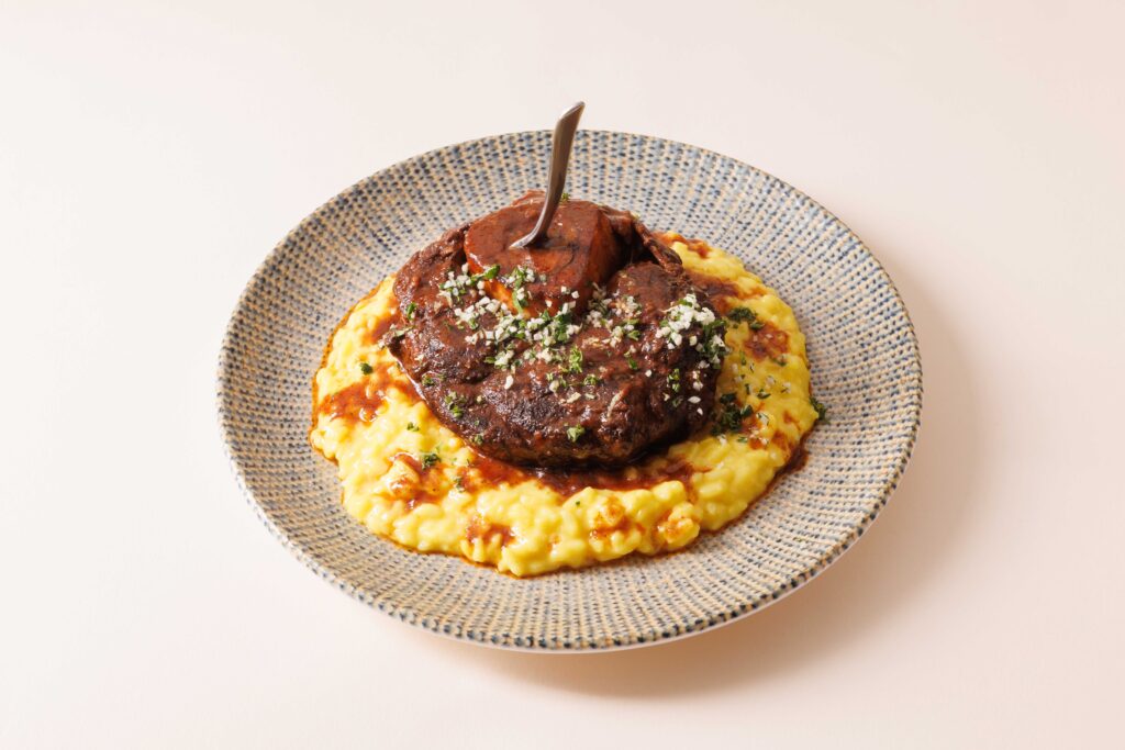 - Risotto Milanese with braised beef, bone marrow and gremolata