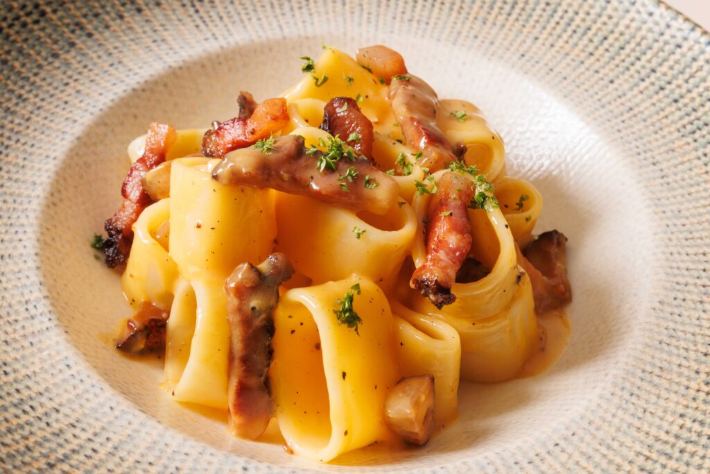 พาสต้าเส้นท่อสั้นผัดกับแก้มหมูรมควัน ไข่แดง และชีสเพโคริโน สูตรคาโบนาราแท้แบบอิตาเลียนดั้งเดิม