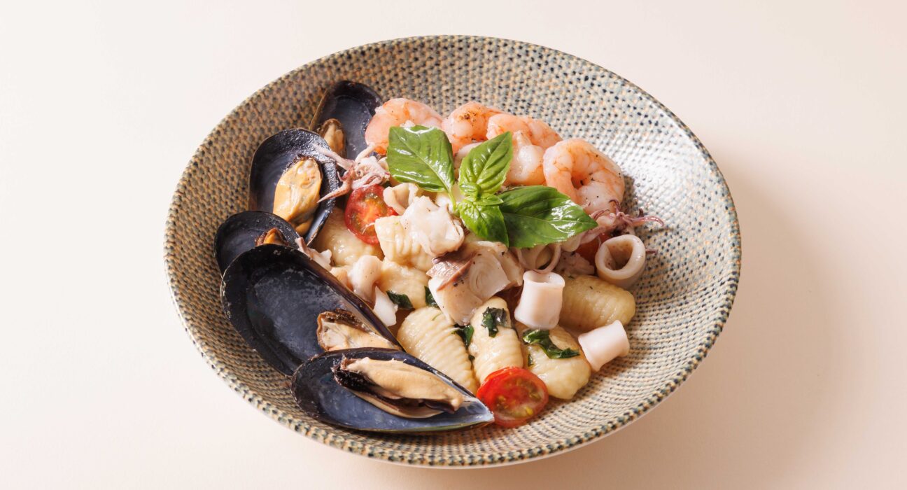 ริซอตโตจากข้าวอาโบริโอ เสิร์ฟพร้อมหอยแมลงภู่ ปลาหมึก และเนื้อปู รสชาติทะเลแบบเต็มคำ - Gnocchi with assorted seafood, cherry tomatoes and basil