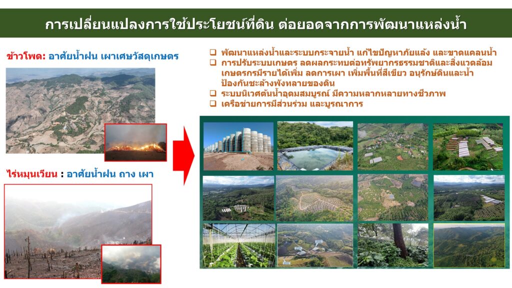 จากนั้น สวพส.จึงต่อยอดในการส่งเสริมให้เกษตรกรปรับสู่ “ระบบการเกษตรแบบประณีตที่เป็นมิตรต่อสิ่งแวดล้อม” เน้นใช้พื้นที่น้อย ใช้น้ำน้อย แต่สร้างมูลค่าสูง โดยแนะนำการปลูกพืชทางเลือกที่มีตลาดรองรับ เช่น ผักในโรงเรือน กาแฟ อะโวคาโด เสาวรสหวาน และโกโก้ พร้อมสนับสนุนระบบให้น้ำที่มีประสิทธิภาพ เช่น ระบบน้ำหยด เพื่อให้ใช้น้ำได้อย่างคุ้มค่า ซึ่งแนวทางนี้ช่วยเพิ่มรายได้ให้เกษตรกร ลดการพึ่งพาพืชเชิงเดี่ยว ลดการเผาในพื้นที่เกษตร และลดผลกระทบต่อสิ่งแวดล้อมได้อย่างยั่งยืน