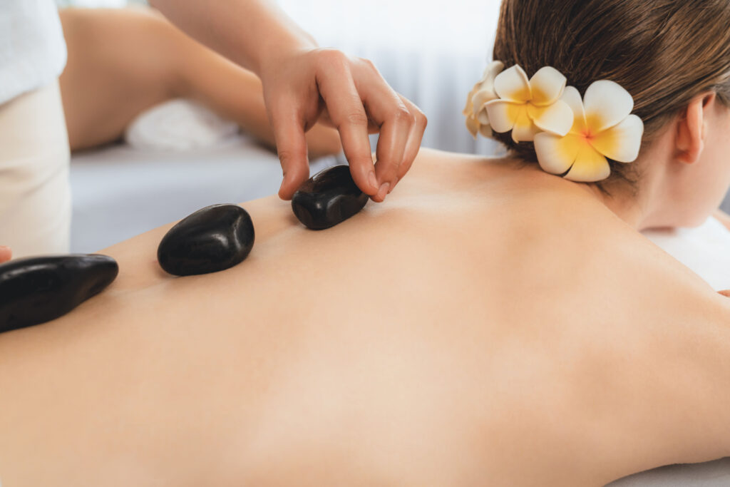Hot stone massage at spa salon in luxury resort with day light serenity ambient, blissful couple customer enjoying spa basalt stone massage glide over body with soothing warmth. Quiescent